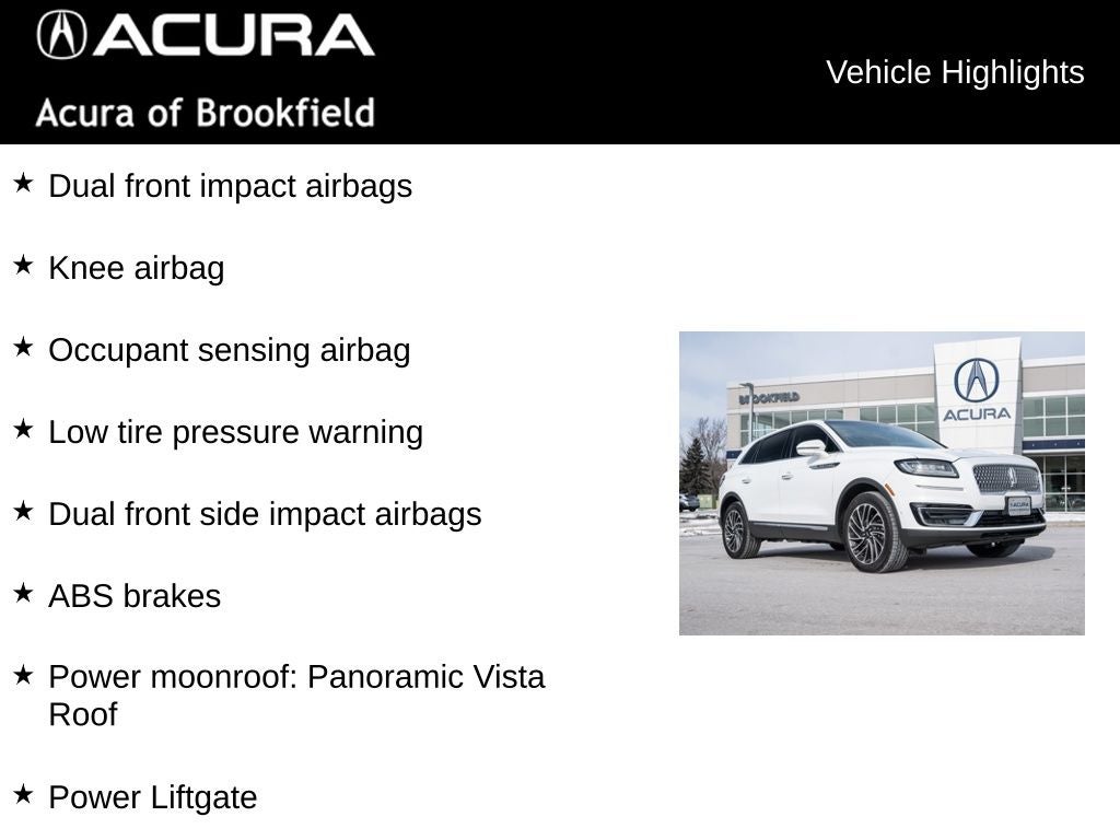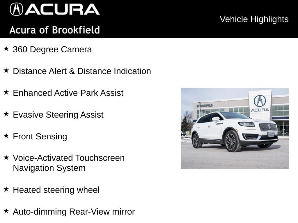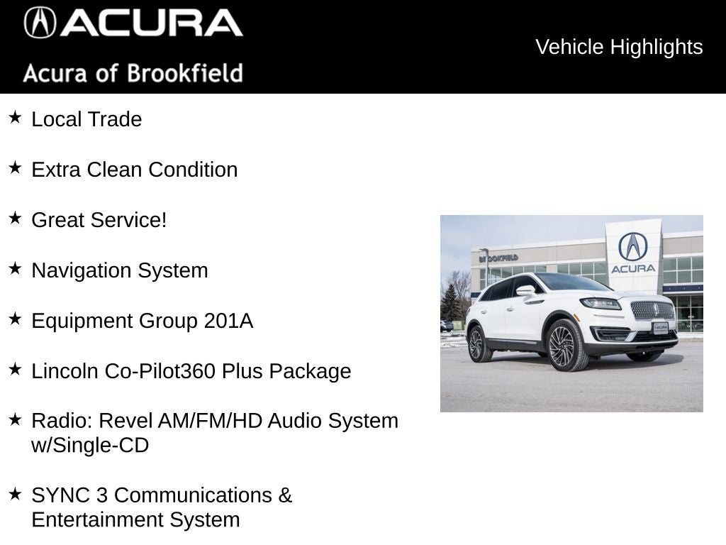 Local Trade, Extra Clean Condition, Great Service!, 360 Degree Camera, ABS brakes, Adaptive Cruise Control, AppLink/Apple CarPlay and Android Auto, Auto High-beam Headlights, Auto tilt-away steering wheel, Auto-dimming Rear-View mirror, Automatic temperature control, Brake assist, Distance Alert & Distance Indication, Dual front impact airbags, Dual front side impact airbags, Electronic Stability Control, Enhanced Active Park Assist, Equipment Group 201A, Evasive Steering Assist, Exterior Parking Camera Rear, Four wheel independent suspension, Front Bucket Seats, Front fog lights, Front Sensing, Fully automatic headlights, Heated front seats, Heated steering wheel, Knee airbag, Lincoln Co-Pilot360 Plus Package, Low tire pressure warning, Memory seat, Navigation System, Occupant sensing airbag, Power driver seat, Power Liftgate, Power moonroof: Panoramic Vista Roof, Power passenger seat, Radio: Revel AM/FM/HD Audio System w/Single-CD, Rain sensing wipers, Security system, Speed-sensing steering, Speed-Sensitive Wipers, Split folding rear seat, Steering wheel mounted A/C controls, Steering wheel mounted audio controls, SYNC 3 Communications & Entertainment System, Traction control, Variably intermittent wipers, Ventilated front seats, Voice-Activated Touchscreen Navigation System, Wheels: 20 Prem Painted Std Bright Machined Alum.
