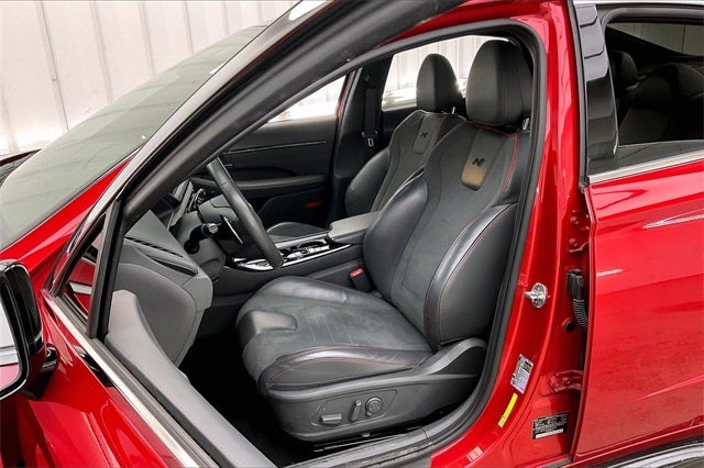 2021 Hyundai Sonata N Line Calypso Red I4 FWD 23/33 City/Highway MPG Black Leather, 12 Speakers, 4-Wheel Disc Brakes, ABS brakes, Air Conditioning, Alloy wheels, AM/FM radio: SiriusXM, Apple CarPlay & Android Auto, Auto High-beam Headlights, Auto-dimming Rear-View mirror, Automatic temperature control, Bose Premium Audio, Brake assist, Bumpers: body-color, Cargo Net, Carpeted Floor Mats, Delay-off headlights, Driver door bin, Driver vanity mirror, Dual front impact airbags, Dual front side impact airbags, Electronic Stability Control, Emergency communication system: Blue Link Connected Car Service (3-year complimentary subscription), Exterior Parking Camera Rear, Four wheel independent suspension, Front anti-roll bar, Front Bucket Seats, Front Center Armrest, Front dual zone A/C, Front reading lights, Fully automatic headlights, Garage door transmitter: HomeLink, Heated door mirrors, Heated front seats, Heated N Unique Sport Seats, Illuminated entry, Knee airbag, Low tire pressure warning, Nappa Leather/Dinamica Seating Surfaces, Navigation System, Occupant sensing airbag, Option Group 06, Outside temperature display, Overhead airbag, Overhead console, Panic alarm, Passenger door bin, Passenger vanity mirror, Power door mirrors, Power driver seat, Power moonroof, Power steering, Power windows, Radio data system, Radio: AM/FM/MP3/HD/SiriusXM Display Audio w/Nav, Rear anti-roll bar, Rear seat center armrest, Rear side impact airbag, Rear window defroster, Remote keyless entry, Reversible Cargo Tray, Security system, Speed control, Speed-sensing steering, Speed-Sensitive Wipers, Split folding rear seat, Spoiler, Steering wheel mounted audio controls, Summer Tires, Tachometer, Telescoping steering wheel, Tilt steering wheel, Traction control, Trip computer, Turn signal indicator mirrors, Variably intermittent wipers, Wheels: N Unique 19 Alloy, Wireless Device Charging, Local Trade!, Black Leather.