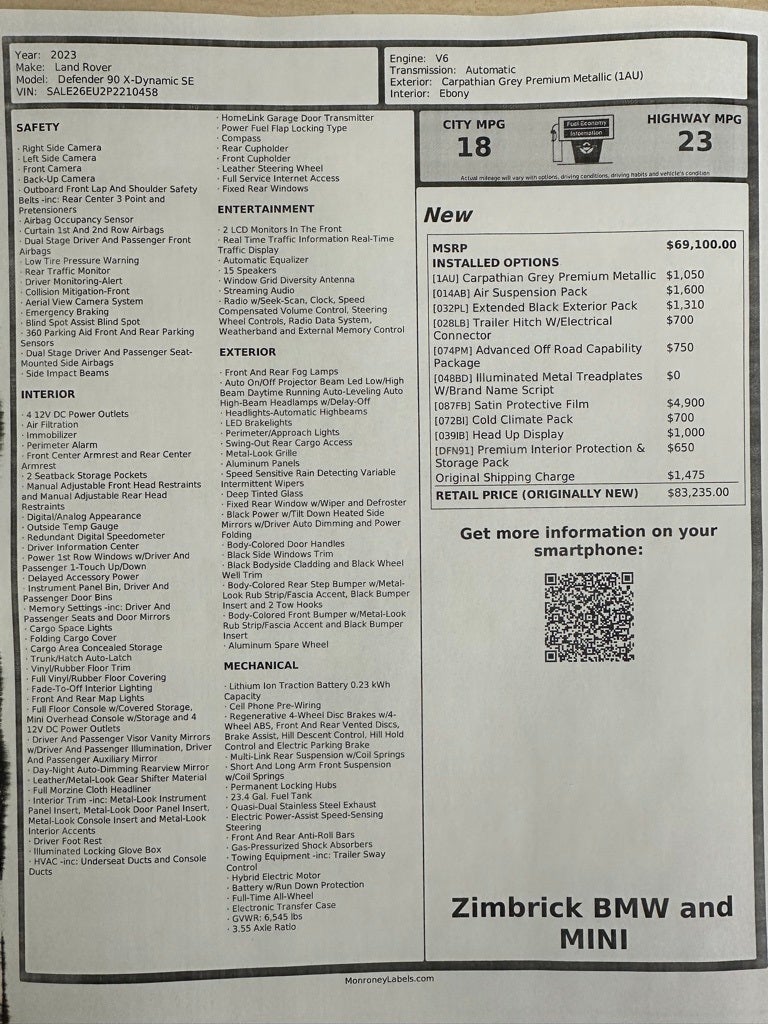 Looking for a 2023 Land Rover Defender 90 X-Dynamaic SE? Look no further! This local trade is in excellent excellent condition! Full Factory Warranty until 5/24/2027 or 50,000 miles! Over 83K new! Options include: